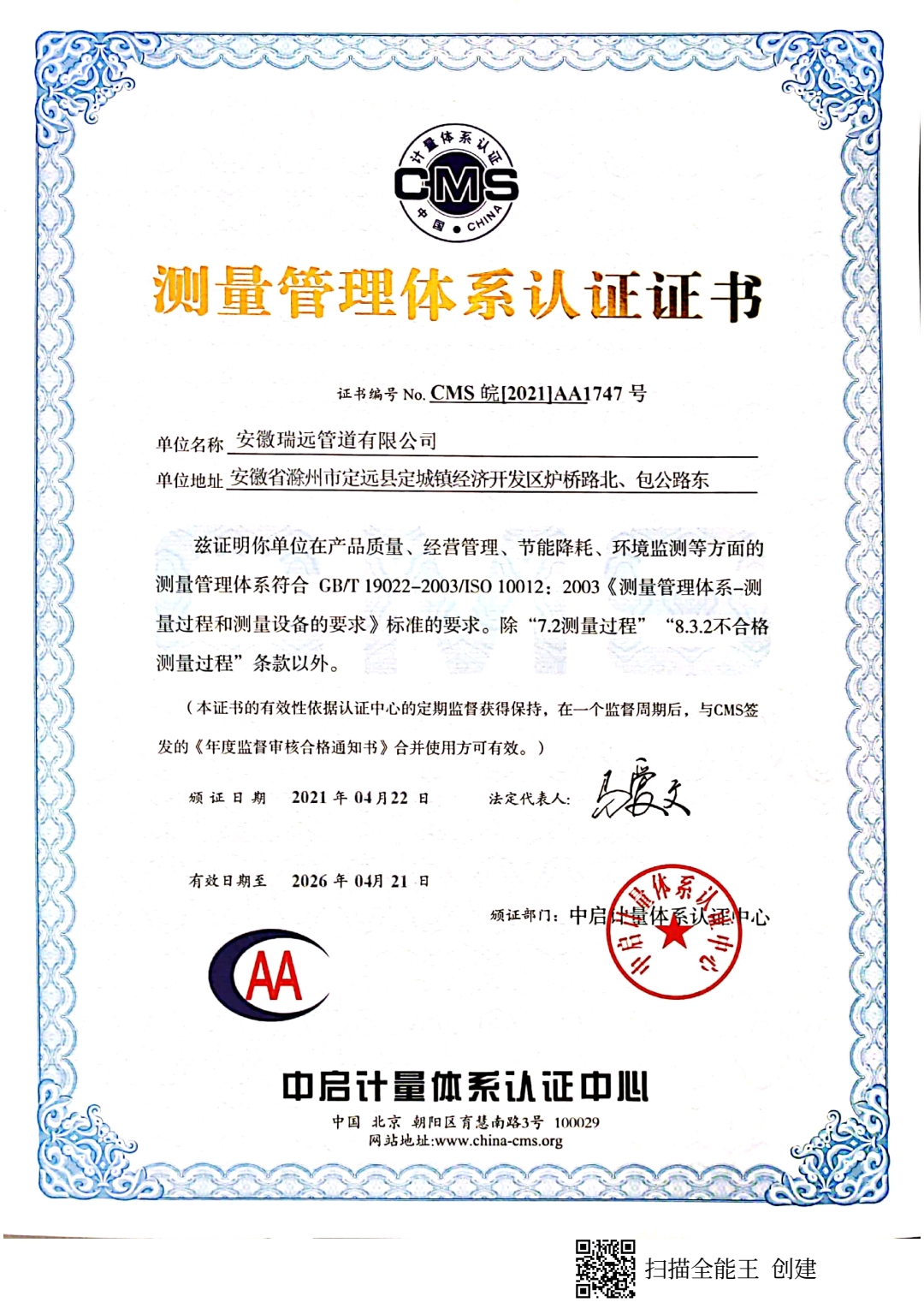 測量管理體系證書